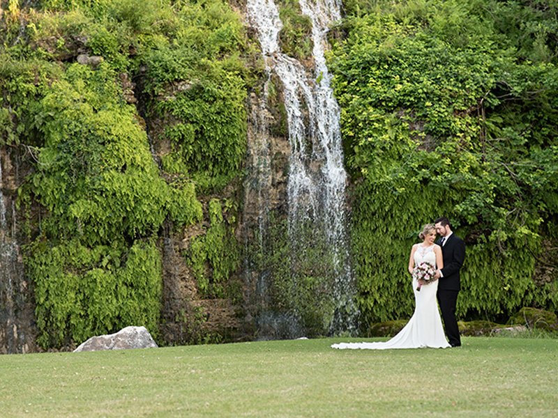Convenience and amenities aside, the waterfalls are one of the biggest selling points of Canyon Springs Golf Club. Okay, make that TWO of the biggest selling points. The property boasts two waterfall areas, each with a unique setting and natural ambiance. The smaller of the two, the Oaks Waterfall is nestled amid low-hanging branches of shady Live Oaks and offers a secluded, private feel. The cozy lawn seats up to 200 guests, making it ideal for the couple who wants a smaller, more intimate gathering.