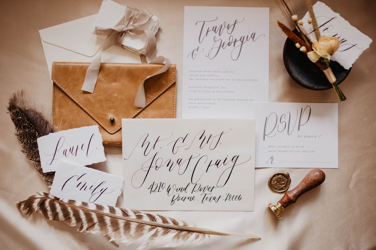 To tie together overall the vision, Lazy Creek Designs’ handwritten calligraphy offered a personal, yet elegant touch to the shoot! Lazy Creek Designs was inspired by, “clean lines and simple elegance. The place cards are hand scripted on delicate handmade paper which makes for a beautiful addition to each place setting. Perfect for intimate weddings of all styles! When it comes to envelope addressing, I always like to think that when a guest receives their wedding invitation, I want them to feel how special this day is going to be for the couple. The extra little detail of hand lettering the guest’s name and address is a lovely personal touch that, I think, conveys just that!”