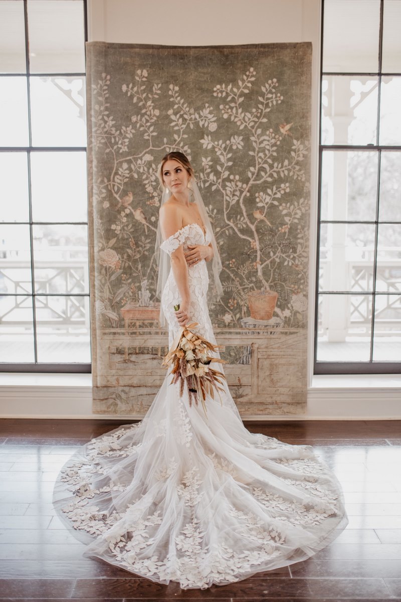 The Homestead at The Dienger Trading Co. offers a blank canvas fit for any kind of bride with its white walls and vintage accents! This venue served as the perfect location for this intimately inspired, boho shoot. With this vision in mind comes this dreamy, bridal, editorial shoot inspired by neutral, warm blooms and specks of gold. From the flowy pampas grass and gold foiled leaves to soft, pink flowers – Viridian Designs showcased our bride beautifully! Ashley with Wild Caravan explains, “I didn’t have an arch that would sing true with the shoot so I wanted to create something. I envisioned something sleek and modern, that would let the florals shine, yet something a little different. With the white walls at Homestead, I wanted a darker color.”